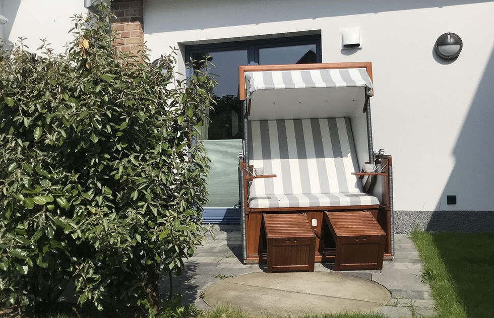 Absolutes Highlight: Eine Terrasse mit Strandkorb mit Blick in den Garten Richtung Westen. Eine sonnige Erholung.